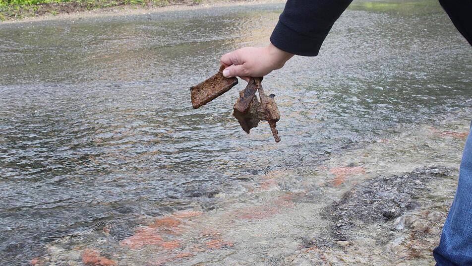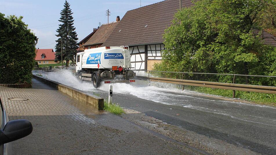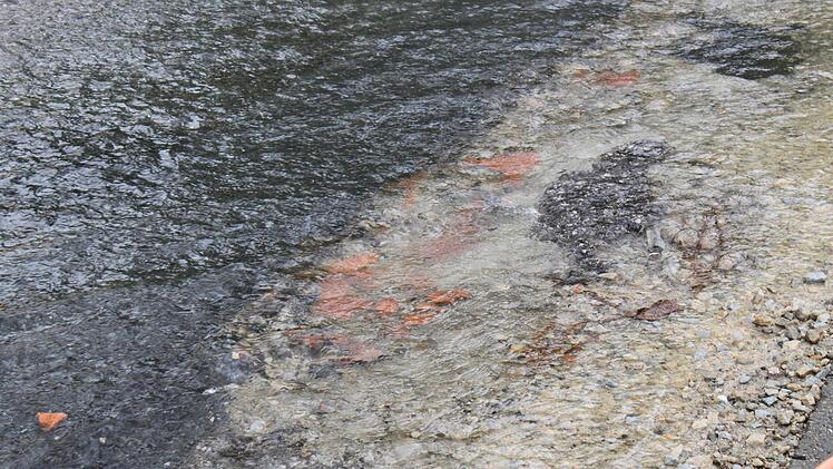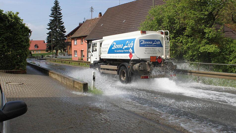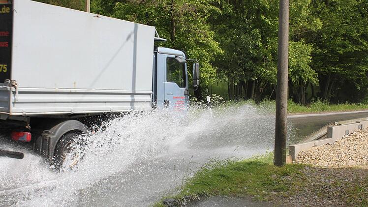 Viel Schwerlastverkehr Es geht aber nicht nur um das Wasser, das in Fontänen hochspritzt, wenn Autos und vor allem die vielen Schwerlaster auf dem Weg von und zum Steinbruch bei Wattendorf hier vorbeifahren. Es ist auch Geröll im Wasser. Nach und nach wird die Straßenkante weggespült, Kies und Ton aus dem Straßenaufbau sind inzwischen dabei, auch Eisenklammern finden sich. Und nach und nach auch Asphalt, der von den Rändern her auf- und abbricht.