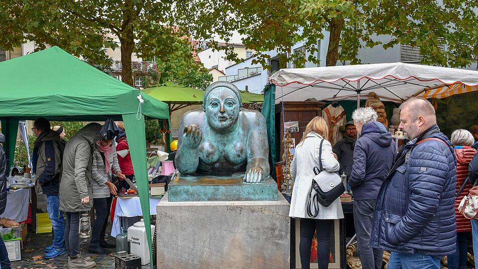 Lunge, Leber, Milz, Galle: alles perfekt trotz der Bierflüsse aus davor stehenden Bamberger Brauereikrügen. Nur die Pumpe ist ausgefallen! Das Anatomiemodell präsentiert sich herzlos! Dafür als augenfälliges Kuriosum auf diesem 20. Antik- und Trödelmarkt am Nationalfeiertag, 3. Oktober. Vor allem die unmittelbare Nachbarschaft auf diesem Tisch des Händlers, der sich "wegen dem Finanzamt" als "Horst Schlemmer" ausgibt, fasziniert: Bambergs berühmtestes Ehepaar, nämlich Heinrich II. und Kunigunde, als Skulpturen um 1840 für schlappe 800 Euro. Allerdings hat ein frommer Vorbesitzer aus der heiligen Kaiserin eher eine Madonna mit blauem Schleier kreiert: "Die Farbfassung müsste entfernt werden", empfiehlt "Horst Schlemmer" einer Interessentin.