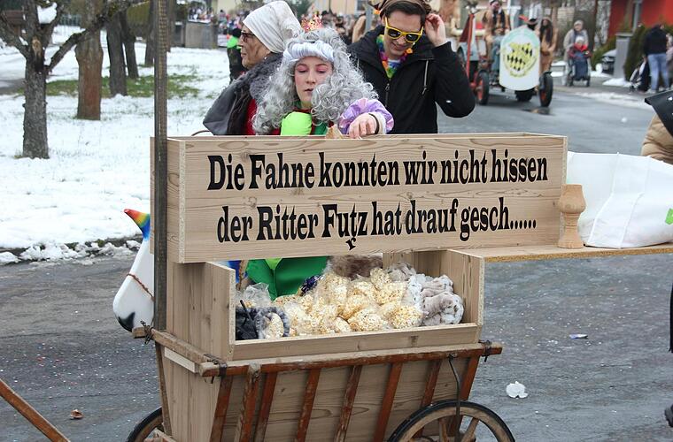 Ein zweits mit dem Altbürgermeister Harald Krug. Die Unterhaider durften nicht fehlen mit etlichen Strichmännchen von der Freiwilligen Feuerwehr, während das Staffelbacher Weingut Wagner lebende Trauben auf die Piste geschickt hatte. Dies alles lässt für den 22. Faschingszug im nächsten Jahr das Beste hoffen.