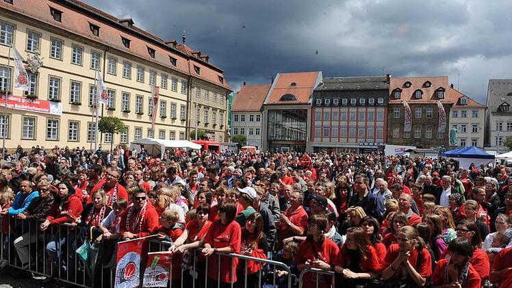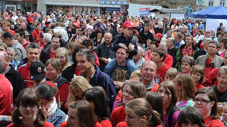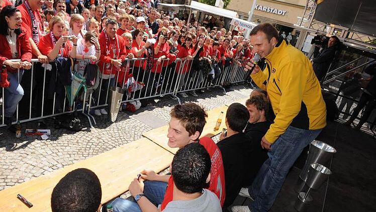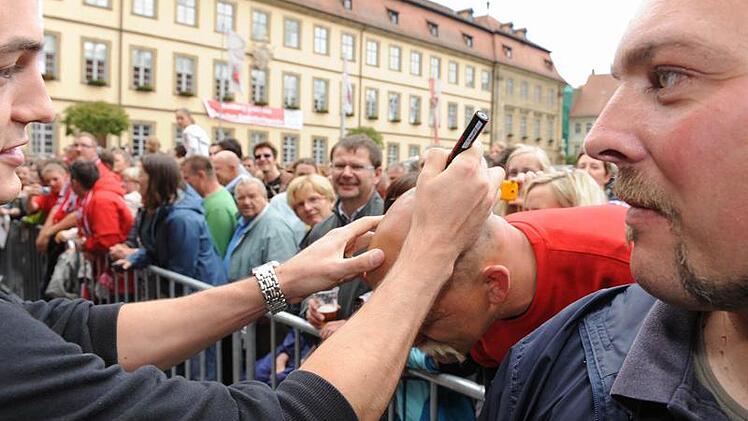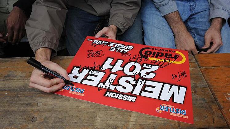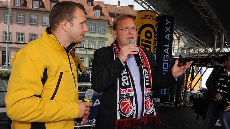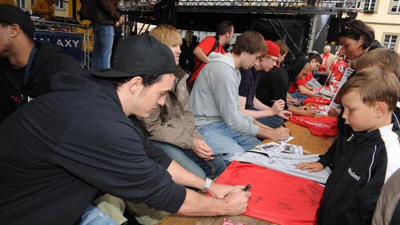 Moderator Jörg Wagner (Radio Bamberg) rief die Sportler mit ihren Vornamen, das Publikum die Nachnamen. Die Brose Baskets selbst waren eher wortkarg, wofür die Fans auf dem Platz größtes Verständnis signalisiertebn. "Der konn a noch nix song!" lautete mancher sanfte Kommentar.
