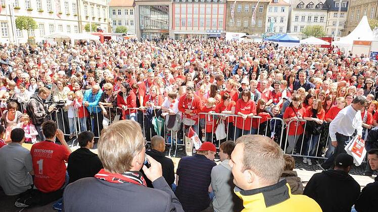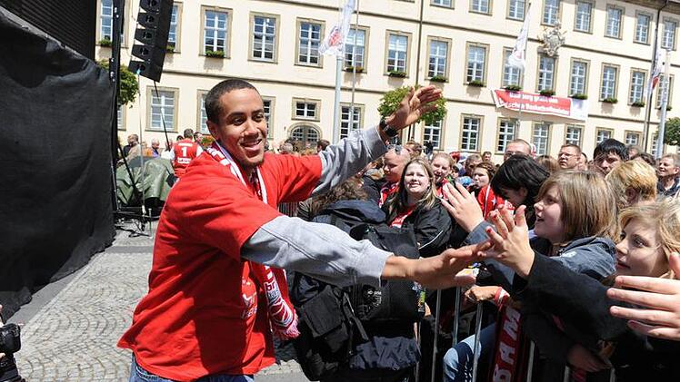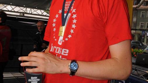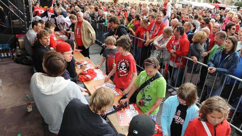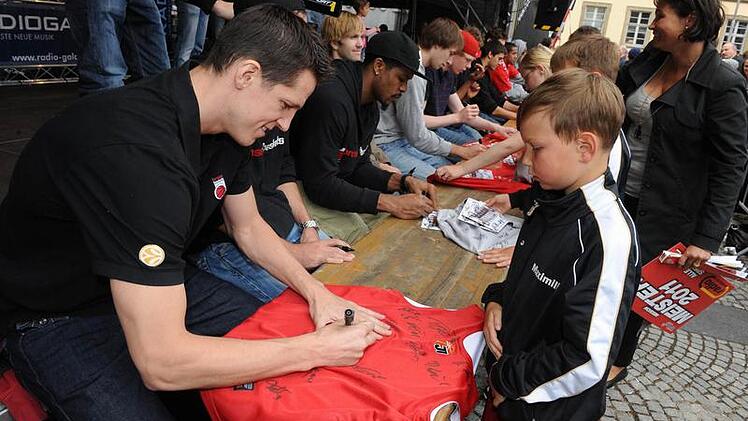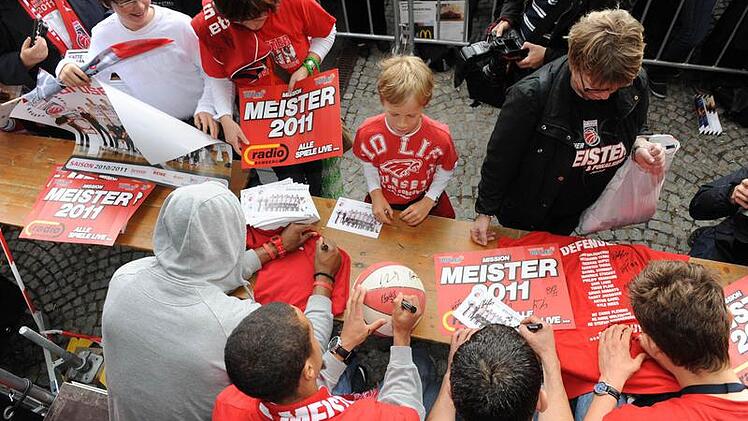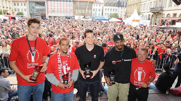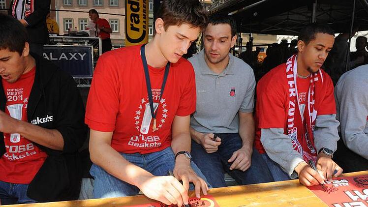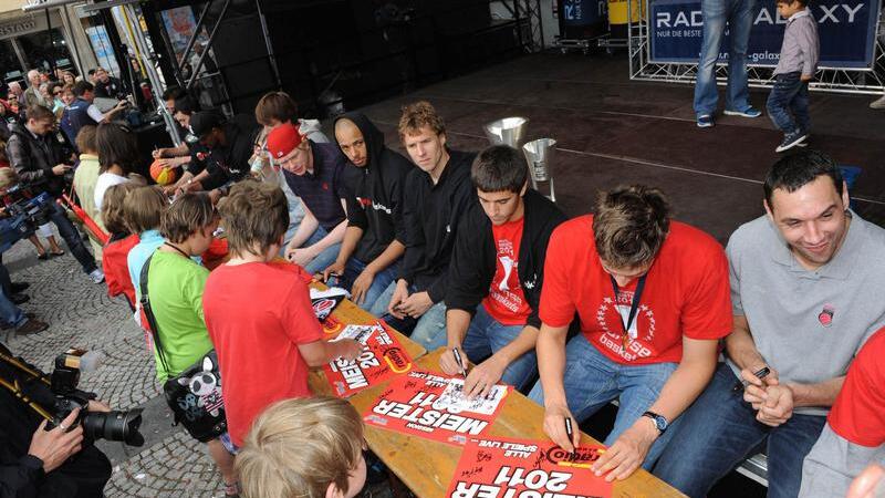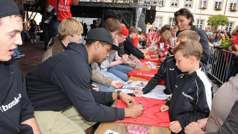 Auf dem Bamberger Maxplatz, wo bis in die Morgenstunden der Titelgewinn der Brose Baskets gefeiert wurde, bereiteten die Fans der Mannschaft einen herzlichen Empfang. Tausende standen um Autogramme an und ließen sich die gute Laune auch nicht von einem Wolkenbruch verderben.