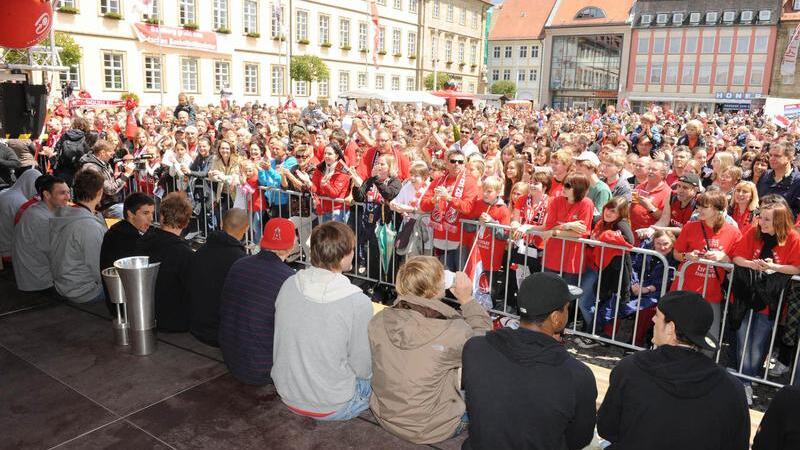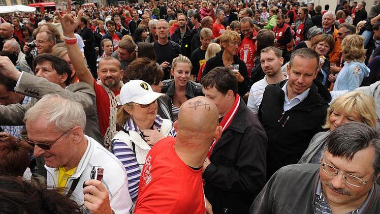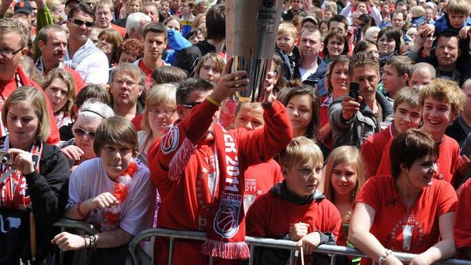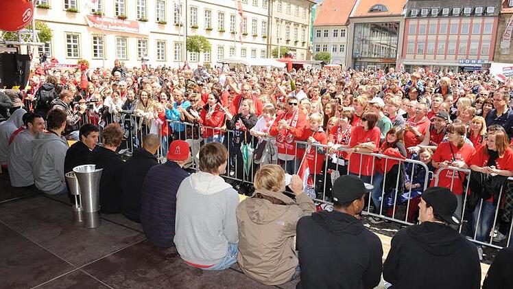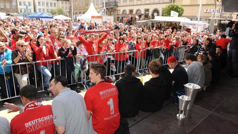 So voll wie bei der Übertragung des Endspiels war der Maxplatz am Sonntagnachmittag nicht mehr. Aber mehrere tausend Fans der Brose Baskets wollten die erfolgreichen Titelverteidiger auch sehen und feiern.