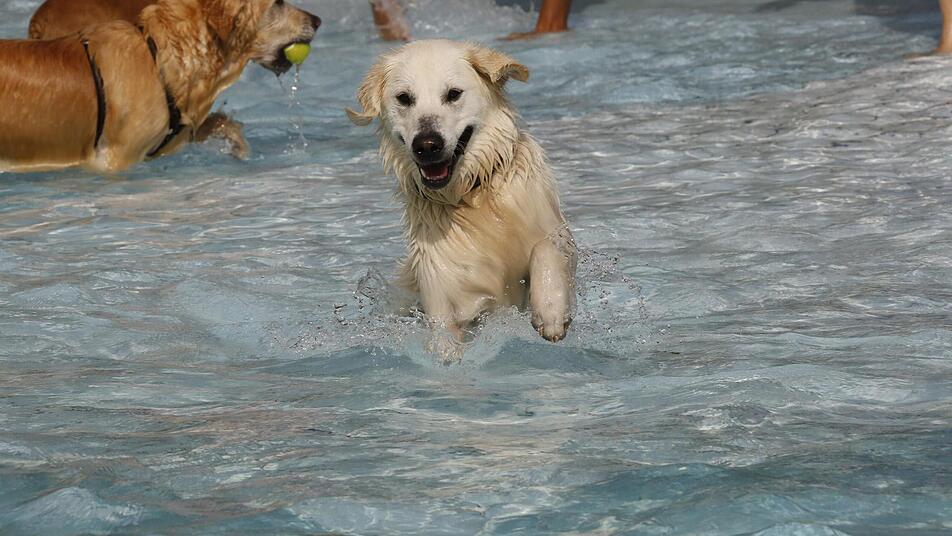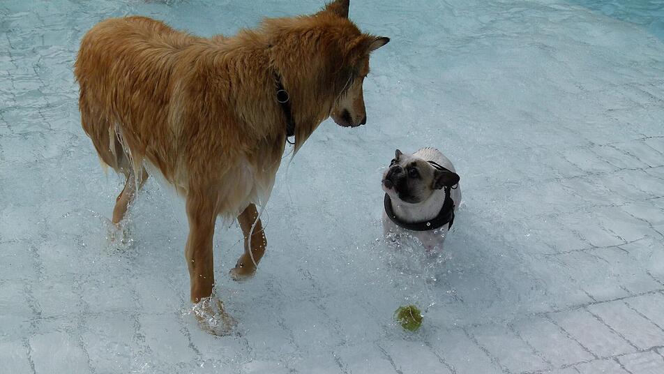 Große und kleine Vierbeiner, wohlgenährte und rappeldürre, schüchterne und draufgängerische wedeln aufgeregt mit den Schwänzen. Beschnuppern sich gegenseitig, bellen freundlich ein Hallo, und ab geht's ins 19,5 Grad warme Nass.