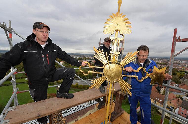 "Das Kreuz ist aus Eisen, seine Oberfläche wurde vergoldet. Es wiegt etwa 120 Kilo", erklärt Tröppner. Die Kugel bestehe aus Kupfer und sei ebenfalls vergoldet. Mit ihren 35 bis 40 Kilogramm Gewicht kann sie gut von zwei Männern getragen werden.