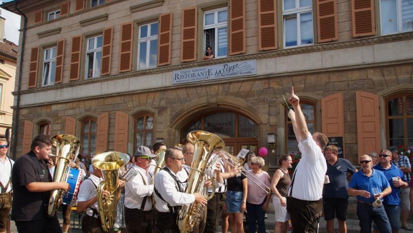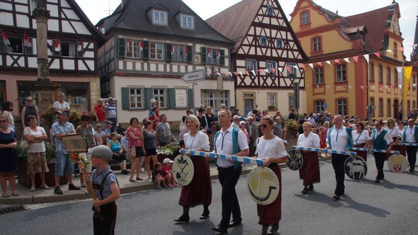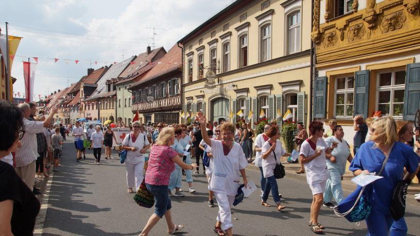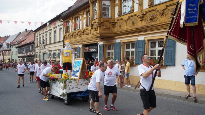 Angeführt wurde der Umzug von der Feuerwehr Scheßlitz mit dem Kirchweihbaum, gefolgt vom Musikverein Scheßlitz mit ihren Musikzwergen. Die Pünzentaler Musikanten und die Musikkapelle Wattendorf brachten gute Laune mit ihrer Musik mit. Stolz trugen die Metzenhüpfer die Zunft- und Vereinszeichen. Eine Pflicht war es natürlich für die Bürgermeister, die Stadt- und Pfarrgemeinderäte, sich im Zug zu zeigen. Zufällig hinter den Politikern aber zeigte die Laufgruppe des TSV, wie es auch in Scheßlitz schneller vorangeht.