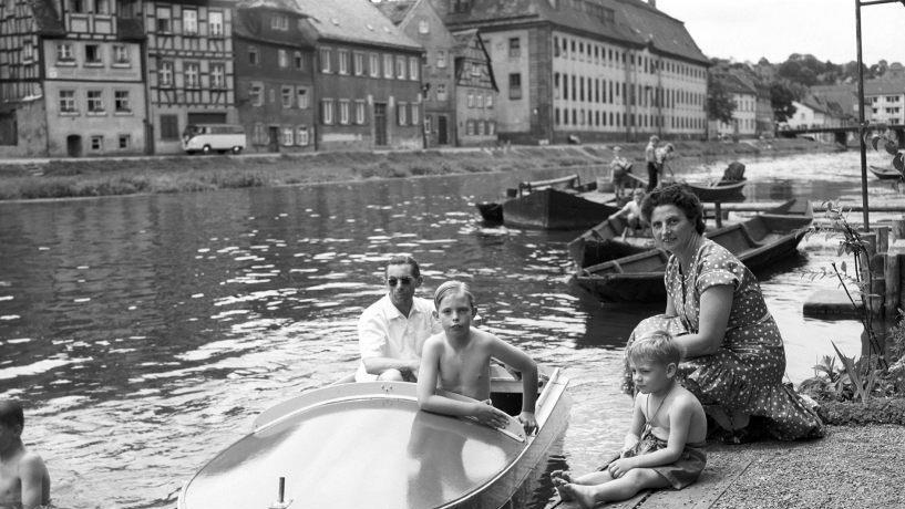 Eine Entdeckung sind auch die vielen atmosphärisch dichten und ästhetisch anspruchsvollen Momentaufnahmen von Straßenzügen, Gebäuden, Grünflächen, Menschen aus dem Bamberg der 1950er und 1960er Jahre. Allesamt aus verblüffenden Blickwinkeln, mit einer Präzision und Könnerschaft, wie sie Hans Tillig (1911 bis 1987) zu eigen war. "Kein Kirchturm war ihm zu hoch, und von den höchsten Positionen neu erbauter Hochhäuser in Bamberg fing er erstaunliche Panoramen ein", erinnert sich Heinz Tillig, der als Bub seinen Vater bei den Fototouren oft begleitete "und die schwere Ausrüstung tragen musste".