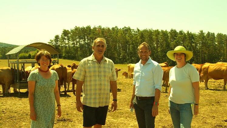 Da Laibarös durch den Ausbau der Staatsstraße zur Zeit und noch mindestens bis Dezember völlig von der Umwelt abgeschlossen ist, musste der Fahrer des Ministers die Flurbereinigungsschleichwege benutzen, kam aber trotzdem pünktlich zum Termin. Haus- und Hofherr Otto Weiß und seine Frau und Kinder begrüßten ihn freundlich. Der Ökolandwirt stellte kurz seinen 120-Hektar-Betrieb vor - Mutterkühe mit Nachwuchs samt Zuchtbullen und Mastschweinen inklusive. Er betreibe auch Ackerbau, erläuterte Weiß, der darauf hinwies, durch seine biologische Anbauweise mehr für die Artenvielfalt zu tun als etwa nur durch den Anbau von Blühstreifen Und er wünschte sich: "Diese Leistungen sollen auch honoriert werden!"