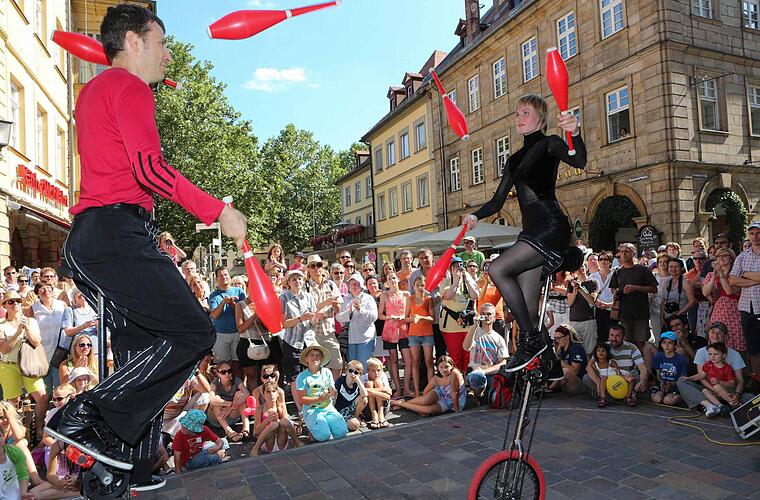 Weil sie schon viel Positives von "Bamberg zaubert" gehört hatten und das Wochenende noch nicht verplant war, hätten sie gerne zugesagt. Zudem, so betonte das Jongleur-Duo, das unter dem Namen "Double Take" auftritt, biete sich bei einem derartigen Festival die einmalige Möglichkeit, neue Nummern vor Publikum zu perfektionieren.