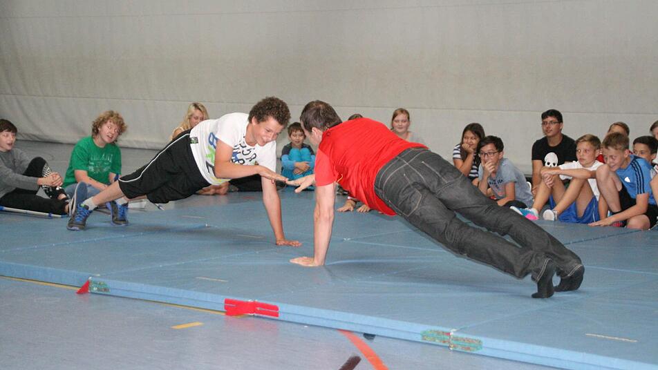 Beeindruckt lauschten die Sechstklässler den Worten des zweifachen Weltmeisters, der sich, neben dem Ringen, auch als Botschafter für die Stiftung Deutsche Schlaganfall-Hilfe engagiert. So brachte der Ausnahmesportler der Klasse 6c zugleich Anzeichen, die auf einen Schlaganfall hindeuten näher und verdeutlichte, dass gerade die Früherkennung Leben retten kann. Auch seine Teilnahme an der bekannten Tanzshow "Let's Dance" war ein Bestandteil der Präsentation und imponierte den Kindern sehr. Abschließend kamen die Schüler noch in den Genuss, gemeinsam mit dem 21-fachen Deutschen Meister ein Probetraining zu absolvieren. Die lachenden Gesichter rundeten diesen doch etwas anderen Deutschunterricht erfolgreich ab.