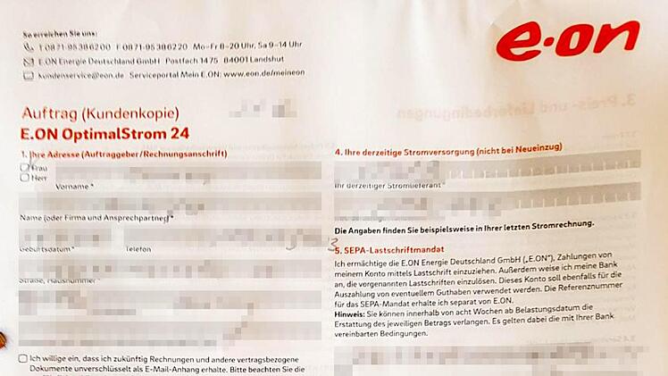 Völlig verunsichert meldete sich Lydia Winter (Name von der Redaktion geändert) bei den Stadtwerken Bamberg. "Was habe ich da unterschrieben?", fragte die 59-Jährige und zeigte die Kundenkopie eines Auftrags an den Energielieferanten Eon. Ein sorgfältig ausgefüllter Vertrag über "Eon OptimalStrom24". Sorgfältig zumindest von Lydia Winters Seite: Name, Anschrift, Sepa-Lastschriftmandat mit Bankverbindung, Zählerstand bei Auftragserteilung, derzeitige Stromversorgung.