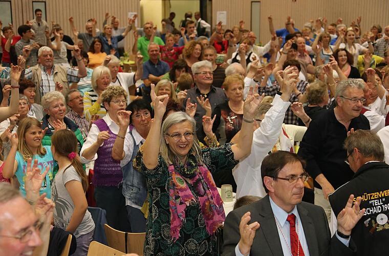Er leuchtete in seinem Polo-Shirt genauso rot wie der gesamte Gesangsverein aus "Häschaa". Die Gruppe sang, passend zum Heimatabend, das Frankenlied sowie "Frankenmadla".