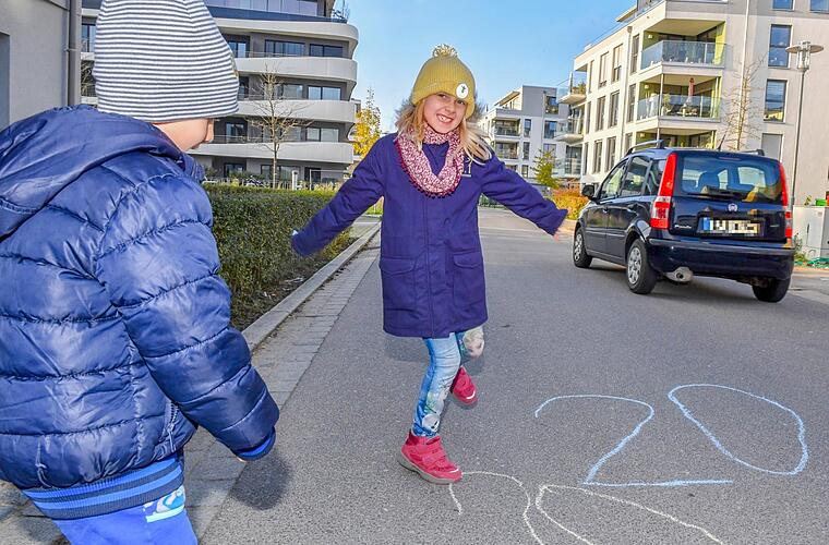 Der fünfjährige Valentin und seine drei Jahre ältere Schwester Antonia malen mit Kreide eine große 20 auf die Straße - um auf die geltende Höchstgeschwindigkeit hinzuweisen. "Ich habe Angst um meine Kinder", sagt Mutter Nadine Luck. Denn die wenigsten würden sich an die Begrenzung halten. Deshalb könnten Antonia und Valentin "nicht so mobil sein, wie sie eigentlich sind". Antonia dürfe etwa nicht mit dem Rad zum Spielplatz fahren, das sei der Mutter zu gefährlich. Obwohl sie könnte, "ohne Stützräder", wie sie stolz erklärt.