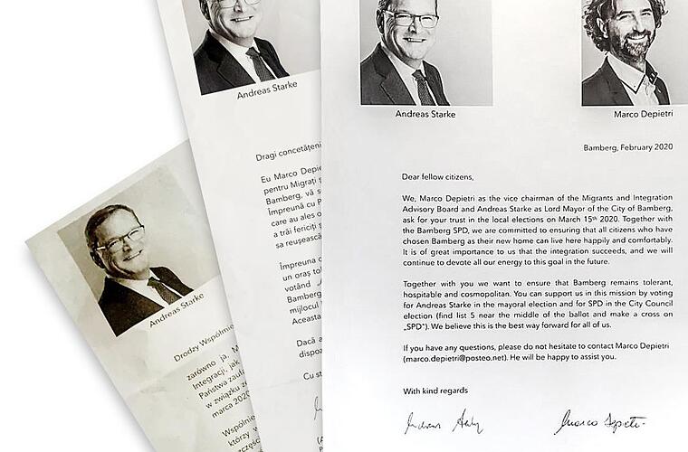 Hört man Marco Depietri, den stellvertretenden Vorsitzenden des Migrations- und Integrationsbeirats (MIB), derzeit kommissarisch im Amt, dann war der Brief an die Migranten ganz klar als SPD-Wahlwerbung erkennbar und deshalb völlig unverfänglich. "Da steht das SPD-Logo drauf. Dadurch sieht doch jeder, dass es kein amtliches Schreiben war", sagt Depietri, der die in etlichen Sprachen übersetzten Wahlbriefe mit verfasst und neben Andreas Starke unterzeichnet hatte. Die Tatsache, dass nach den Namen die Funktion erscheint, hält Depietri für völlig unproblematisch - ebenso wie dies bereits im Februar letzten Jahres OB Andreas Starke dargelegt hatte. Aus Starkes Sicht stellt die Ergänzung der Namen um die Funktion in beiden Fällen eine richtige und erlaubte Information dar. "Auch andere Wahlkämpfer unterschreiben ihre Brief mit ihren Ämtern."