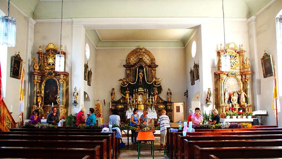In dem kleinen Juradorf Ludwag hat das Wurzbüschelbinden eine besondere Tradition. Zuerst nämlich wird der Wurzbüschel für die Kirche und auch in der Kirche St. Johannes der Täufer gebunden.
