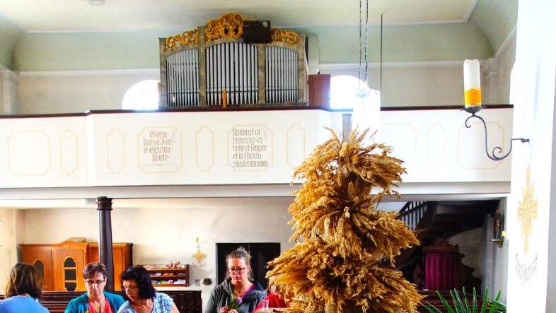 Vorher schon wurde eine Girlande aus Ähren von verschiedenen Getreidesorten gebunden und diese dann auf einem Holzgestell spiralartig von oben nach unten befestigt. Da sie über das Jahr sorgfältig aufgehoben wird, kann man sie schon einige Jahre wiederverwenden.