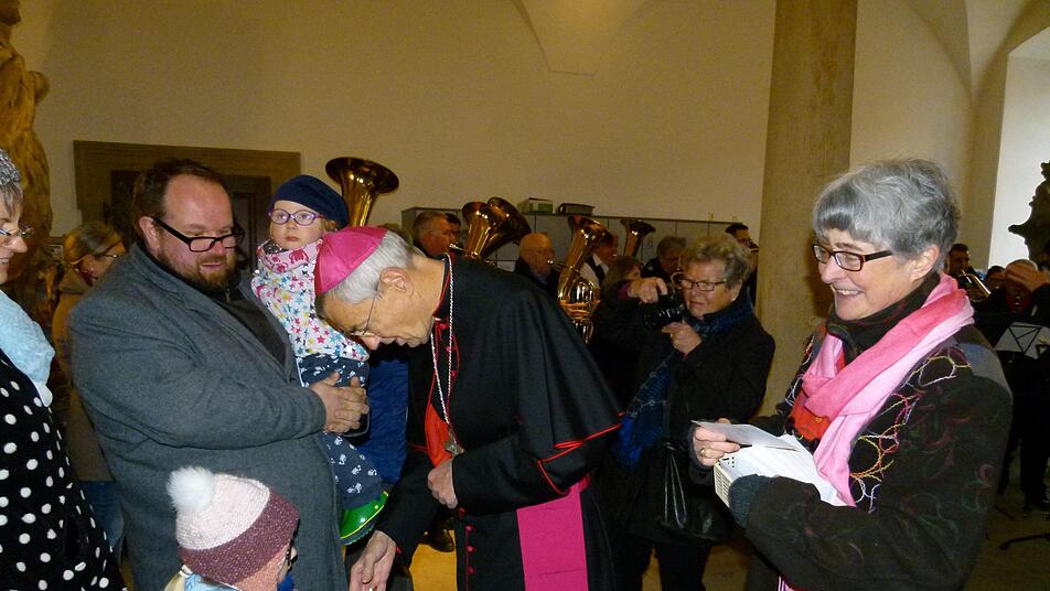 Der regnerischen Witterung geschuldet, fand die traditionelle Agape mit Kunigundenringen und -wein im Kreuzgang des Domes und Foyer des Diözesanmuseums statt. Die Don-Bosco-Musikanten spielten auf, die "Kunigunden" holten sich den erzbischöflichen Händedruck zum Namenstag ab und freuten sich über das gedruckte Andenken an dieses Ereignis, das Claudia Dworazik, die Diözesanvorsitzende des Frauenbundes, bereit hielt: Die Abbildung eines seltenen Kupferstiches aus dem 18. Jahrhundert, der die Kaiserin Kunigunde als Nonne im Kloster Kaufungen zeigt, wohin sie sich nach dem Tod ihres Mannes Heinrich 1024 zurückzog. Auf dem Bild ist sie zu sehen, wie sie liebevoll eine Mitschwester pflegt, die krank im Bett liegt.