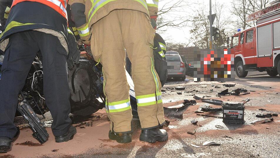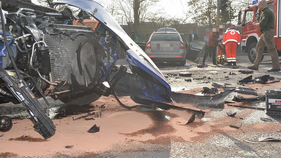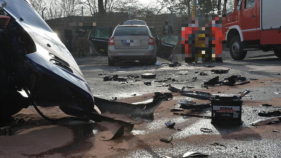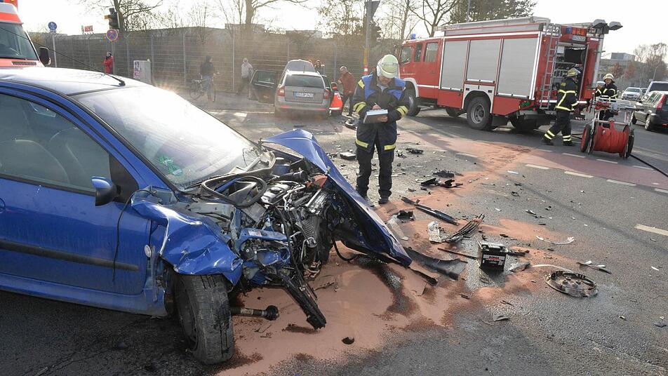 Der vordere Teil des blauen Peugeot sieht heftig aus - kaum zu glauben, doch der Fahrer des Wagens wurde nur "mittelschwer" verletzt, wie es Polizeisprecherin Silke Gahn formuliert. Die beiden Insassen des zweiten am Unfall beteiligten Fahrzeuges, Fahrer und Beifahrerin eines Skoda Octavia, wurden leicht verletzt.