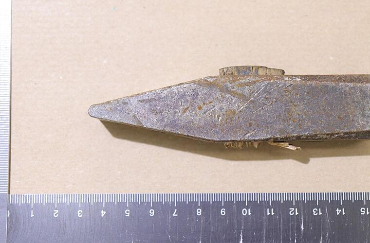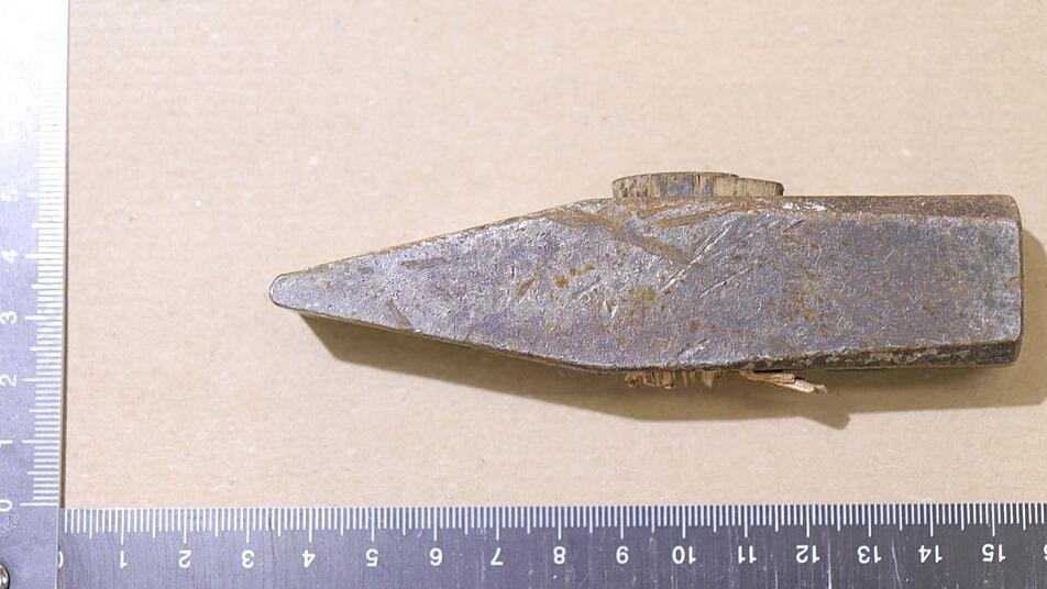 "Bei dem aufgefundenen, 500 Gramm schweren Hammerkopf handelt es sich um einen älteren Schlosserhammer. Auffällig an dem Kopf des Hammers sind die Reste der silbernen Lackierung, die sich an Ober- und Unterseite finden. An der Spitze der Finne und an der Seite der Finne fanden sich rötliche Lackanhaftungen. Auffällig ist auch die Abplatzung an der, von hinten gesehen, rechten Kante der Schlagfläche. Der Hammerstiel aus Eschenholz ist abgebrochen", beschreiben die Beamten den Hammer.