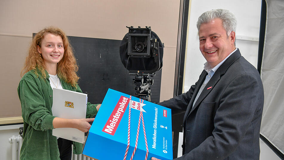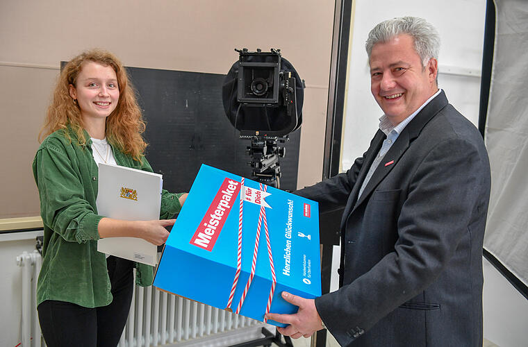 Klar ist für Lara Müller auch, wie es weitergehen soll. Sie hat mittlerweile den Arbeitgeber gewechselt und arbeitet nebenberuflich schon selbstständig und als Assistenz bei einem Fotografen. Einfach, um noch weitere Erfahrungen in ihrem Traumberuf zu sammeln. Mittelfristig sieht sie sich aber schon in ihrem eigenen Fotostudio. Auf jeden Fall freute sie sich riesig über den Besuch von HWK-Präsident Matthias Graßmann, der ihr das Meisterpaket überreichte."