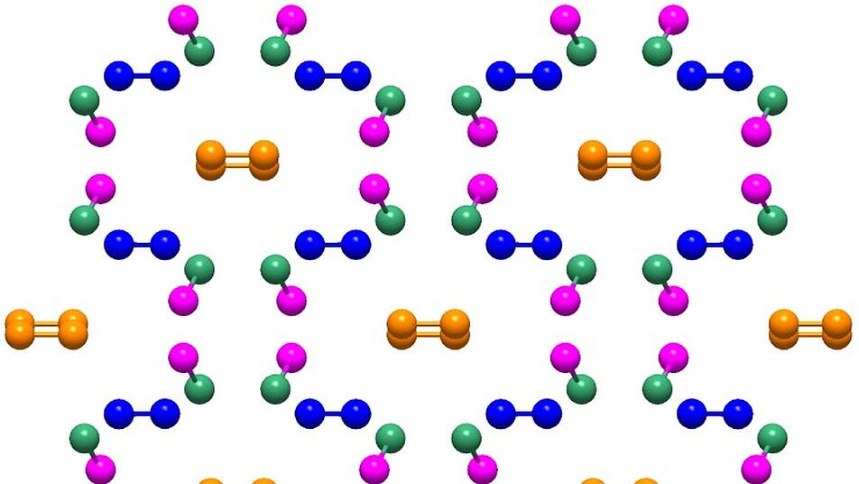 Die Zeta-N₂-Phase des Stickstoffs, die zwischen 60 und 115 GPa existiert, ist ein entscheidendes Puzzlestück für das Verständnis des Übergangs von molekularem zu polymerem Stickstoff. Doch trotz zahlreicher Untersuchungen war ihre Kristallstruktur (d. h. die Anordnung der Stickstoffmoleküle) bisher unbekannt - und der Weg zur Entschlüsselung des seltsamen Verhaltens von Stickstoff. Dem Forscherteam unter der Leitung von Dominique Laniel (Universität Edinburgh) sowie Natalia Dubrovinskaia und Leonid Dubrovinsky (Universität Bayreuth) gelang es mit einer in Bayreuth neu entwickelten experimentellen Technik, die Kristallstruktur von Zeta-N₂ zu bestimmen. Die Forscher pressten molekularen Stickstoff in Diamant-Ambosszellen auf extreme Drücke zwischen 60 und 85 GPa, wie sie im Erdmantel herrschen. Durch Lasererwärmung auf bis zu 2.000 Grad Celsius gelang es ihnen, hochwertige Submikrometer-Körner von Zeta-N₂ zu rekristallisieren. Ihre Kristallstruktur (siehe Abbildung) wurde mit Hilfe der Synchrotron-Einzelkristall-Röntgenbeugung gelöst und verfeinert. Aus diesen experimentellen Ergebnissen gewannen Theoretiker an der Universität Linköping (Schweden) weitere Erkenntnisse über den einzigartigen Polymerisationsprozess von Stickstoff.