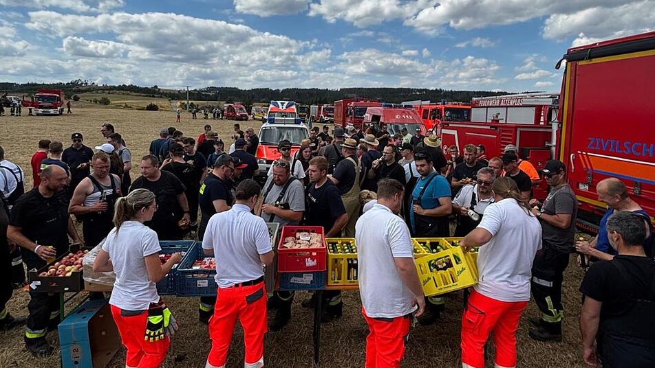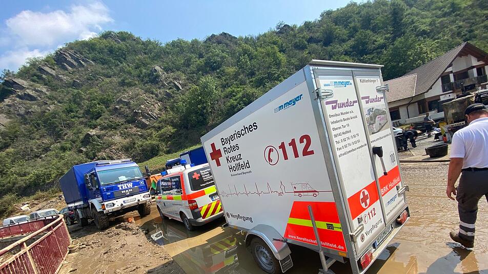Bei Naturkatastrophen wie der Flut im Ahrtal 2021, dem Hochwasser in Südbayern 2024 oder den Waldbränden in Thüringen 2025 stellt das BRK Hollfeld aus dem Landkreis Bayreuth nach eigenen Angaben unter anderem die Verpflegung und Versorgung der Feuerwehr mit einem 50-köpfigen Team sicher.