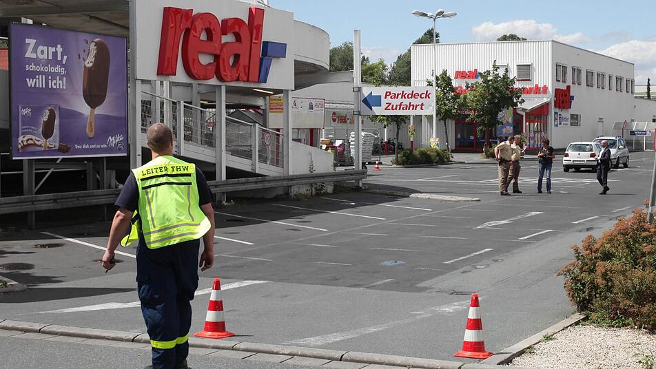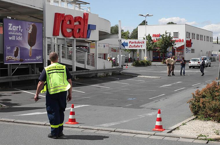 Die Polizei sperrte den Bereich rund um einen Supermarkt weiträumig ab. Die Mitarbeiter des Real-Marktes wurden aus Sicherheitsgründen an eine Sammelstelle gebracht. Eine Vielzahl von Feuerwehrleuten sowie Kräfte des Technischen Hilfswerks unterstützen die Polizei hierbei.