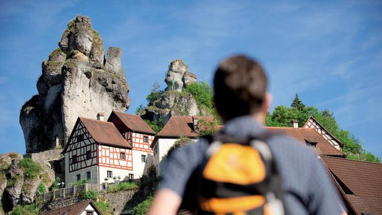 Das Fränkische Schweiz-Museum in Tüchersfeld ist eines der bekanntesten Foto-Motive der Fränkischen Schweiz. Ein Besuch im Museum lohnt sich alleine wegen des malerischen Anblicks auf die Museumsgebäude: Die aus dem 18. Jahrhundert stammenden Fachwerkhäuser schmiegen sich direkt an die beiden hoch aufragenden Felsnadeln, für die die Ortschaft bekannt ist, und wirken fast so, als hätte man sie direkt an den Fels geklebt.