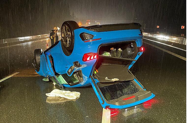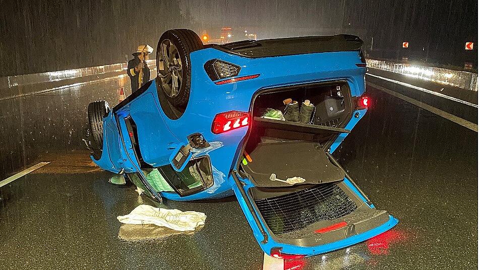 Auf der A9 hat sich bei Starkregen ein 21-Jähriger mit seinem Auto überschlagen. Das Auto kam erst nach 300 Metern auf dem Dach zum Liegen.
