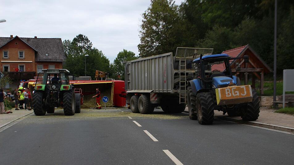 Ein 25-jähriger Traktorfahrer hat im Landkreis Bayreuth für einen Unfall gesorgt: In Hummeltal geriet der Mann mit seinem Fahrzeug ins Schlingern. Sein mit gehäckseltem Mais beladener Anhänger kippte um, der Inhalt ergoss sich über die Fahrbahn.