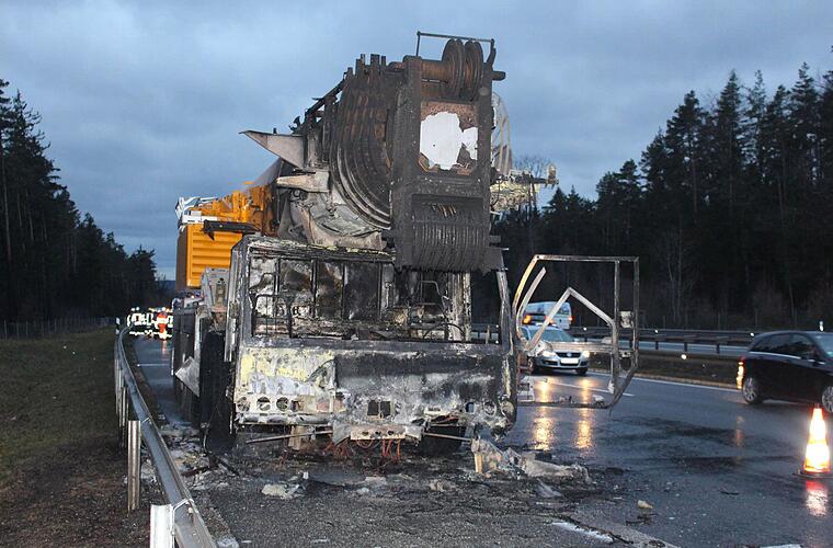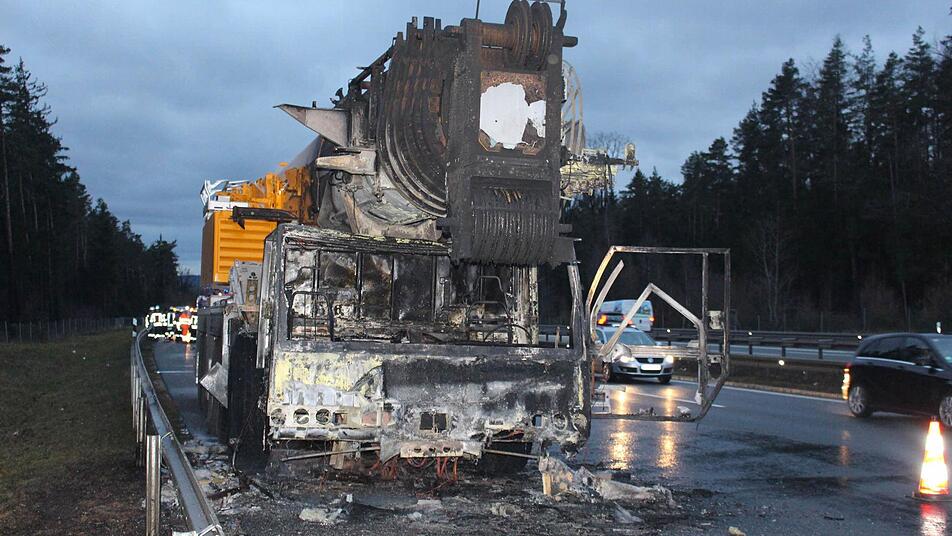 Trockau lichterloh gebrannt. Die Autobahn musste daher zeitweise komplett gesperrt werden. Wie die Polizei berichtet, war ein technischer Defekt eines fabrikneuen Spezialfahrzeuges die Ursache für einen brennenden Autokran auf der Autobahn.