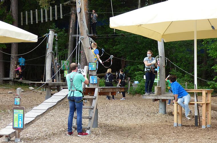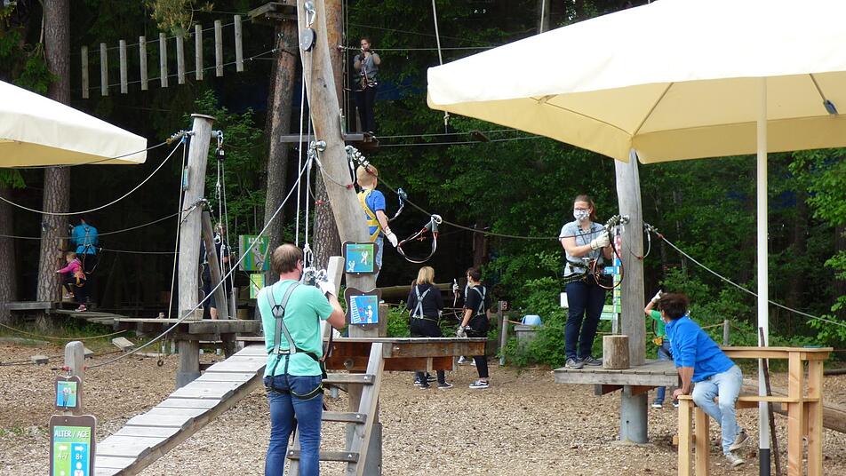 Reger Betrieb herrschte im Pottensteiner Kletterwald. Auch hier geht nichts ohne vorherige Reservierung. "Es ist schon etwas nervig, weil ständig das Telefon klingelt", sagt eine Angestellte, die Buchungen entgegennimmt. Wer rein will, muss sich auf jeden Fall bei der Kasse registrieren. Also Name, Anschrift und Telefonnummer angeben. Darauf weist ein großes Schild am Parkplatz hin.