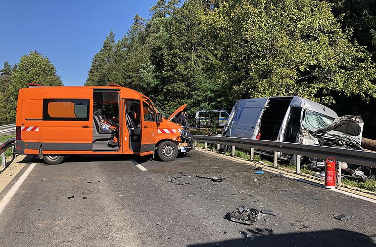 Update vom 18.09.2020, 14.55 Uhr: Straßenmeisterei-Fahrzeug kracht in Werkstattwagen - drei Verletzte kommen ins Krankenhaus
