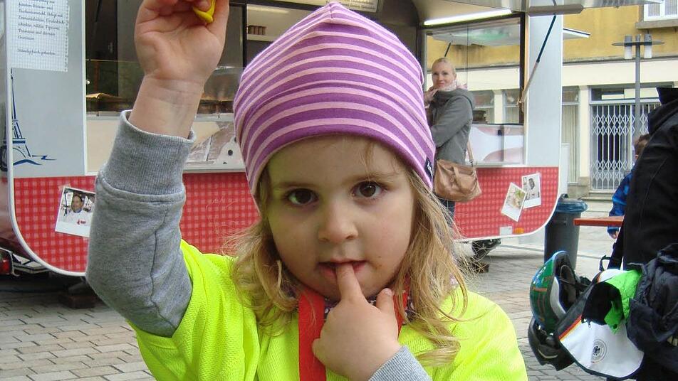 "Ich glaube, ich habe jetzt Muskelkater" So mancher Steppke benötigte bei seiner Laufrunde noch die helfende Hand von Mama oder Papa. Dabei meinte der Vierjährige Ben ganz cool: "Das war nur eine Runde zu laufen, eigentlich nur einmal um das große Haus." Die Medaille, die jeder der kleinen Läufer erhielt, ließ die kurze Anstrengung auch schnell vergessen. Eine der jüngsten Teilnehmerinnen, die dreijährige Jana, hatte trotzdem Bedenken: "Ich glaube ich habe jetzt Muskelkater," war ihre Einschätzung zum Rennen.