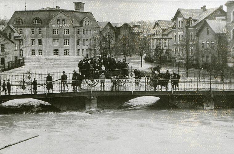 Und sie tat es tüchtig, kopfüber gings vom Geländer der Schafstegbrücke in die strömende Flut, und es war trotz allen Unglücks eine helle Freude, wie sich die jugendkräftigen Gestalten im brausenden Strom tummelten. Die zahlreichen Coburger, die tagsüber die Neugierde auf die Schafstegbrücke führte, werden mit stillem Dank derer gedacht haben, die die Itzregulierung seinerzeit durchführten und dadurch auch diesmal wieder die Stadt Coburg und ihre Bewohner vor ungeheurem Schaden bewahrten.