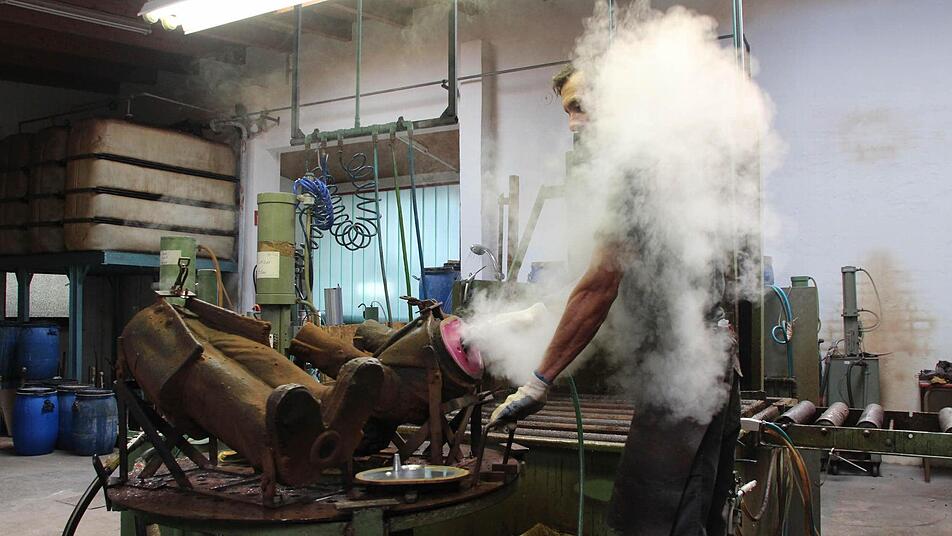 Igor Chramov nimmt einen großen Schluck aus seiner Flasche, bevor er sich wieder der Hitze des Ofens aussetzt. Alle elf Minuten öffnet sich das Metallmonstrum und bläst dem 42-Jährigen die Wärme von 290 Grad Celcius entgegen. Heraus kommen zwei Metallformen, in denen Ober- und Unterkörper sowie Hände von Richard Wagner stecken. Die Formen mit dem gehärteten Plastik kommen sofort ins Wasserbad - es brodelt und spritz.