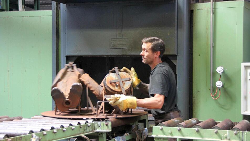 "Ohne Füllung wären die Figuren sehr wackelig. Am Ende wiegen sie rund 8 Kilo", sagt Messner. An diesem Tag kommen nur Wagner-Figuren mit einem hellen Violettfarbton aus dem Ofen und danach in die Hände von Messner. An einem Tag schaffen die Neustadter rund 25 solcher Figuren, 500 müssen sie bis heute zur Ausstellungseröffnung geliefert haben. Nachdem sich während der Produktion ein Mitarbeiter schwer an der Hand verletzt hat, ist es noch stressiger geworden.
