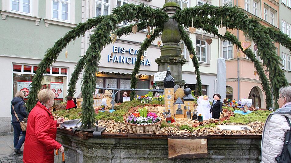 Carsten Bauer, Kursleiter des Projekts "Leila" der Beruflichen Fortbildungszentren der Bayerischen Wirtschaft (bfz), erklärt was hinter der Dekoration des Bürglaßbrunnens steckt: "Unsere Dekoration stellt das Schloss Rosenau dar. Die Blumen und Steine zeigen den Park. In der Mitte befindet sich ein Pavillon und vor diesem stehen selbst modellierte Figuren von Prinz Albert, Königin Victoria und ihren Kindern." Passend zum Thema der Brunnenstraße, soll die Gestaltung "die tiefe Zuneigung des Ehepaares zeigen".