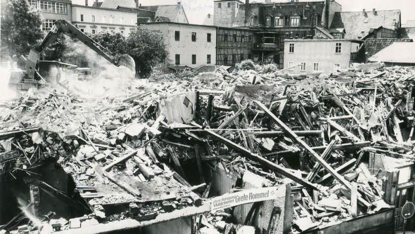 Jedenfalls seitdem mit dem Abbruch der Häuser ind er Webergasse begonnen wurde", schrieb das "Tageblatt" im Juni 1975 und meinte damit durchaus wörtlich zu nehmende Nöte der Anwohner: "Den Hausfrauen der umliegenden Häuser bereitet dies großen Kummer", hieß es weiter: "Zumal mit nur einem Wasserstrahl die Dreckschwaden der zusammenbrechenden alten Mauern wohl kaum zu bändigen sind."