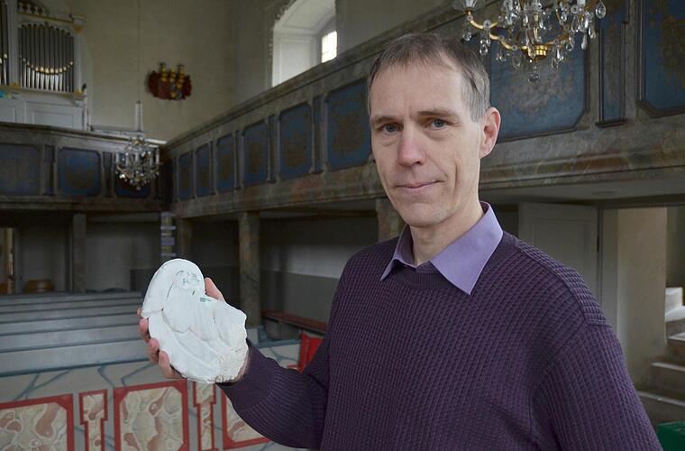 "In den Geschichten aus der Bibel haben die Engel meist keine Flügel", sagt Pfarrer Ronald Henke. Anders in der Kirche seiner Gemeinde in Hassenberg. Zur überaus reichen Stuckdecke gehören eine Reihe von Engeln, die eben durch ihre Flügel als solche zu erkennen sind. Bis auf einen, der jetzt einen Flügel verloren hat. Das Stuckteil ist herabgestürzt, und das ist ein Problem - nicht nur, weil deswegen ein geplantes Chorkonzert nach Gestungshausen verlegt werden musste.