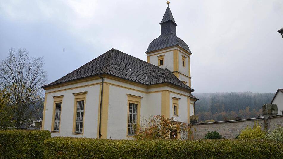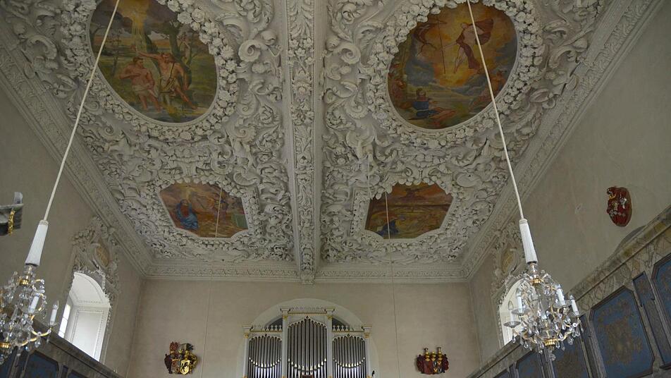 Die Stuckdecke der kleinen Barockkirche ist eine Besonderheit. Sie stammt aus dem Jahr 1690. Anders als die meisten Stuckdecken zeigt diese keine flachen Verzierungen. Vielmehr gibt es zahllose große Früchte und Blüten in ihrer ganzen dreidimensionalen Ausprägung und dazwischen eben einige Engel. "Diese prachtvolle Deckendekoration wirkt überwältigend und ist äußerst selten. Ein Eckzimmer in der Coburger Ehrenburg wurde - wohl von denselben Künstlern - Ende des 17. Jahrhunderts genauso ausgestattet", berichtet Pfarrer Henke. Sonst gibt es Vergleichbares im weiten Umfeld nicht.