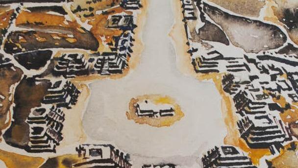 Jetzt nun, statt der massiven Dichte des eisendurchsetzten Acryls, die Transparenz der Wasserfarbe, die den Atem der Jahrtausende in unser Bewusstsein lässt. Nicht die Pracht der großen Kulturvölker rückt Benno Noll in unseren Blick, wie es so oft geschieht auch zur selbstgefälligen Bestätigung der Bedeutung des Menschen auf dieser Erde. Benno Noll lässt uns aus extremer Perspektive von hoch oben blicken - auf letzte Reste großer Vergangenheit, auf Ruinen des menschlichen Geistes und seines Schaffens.