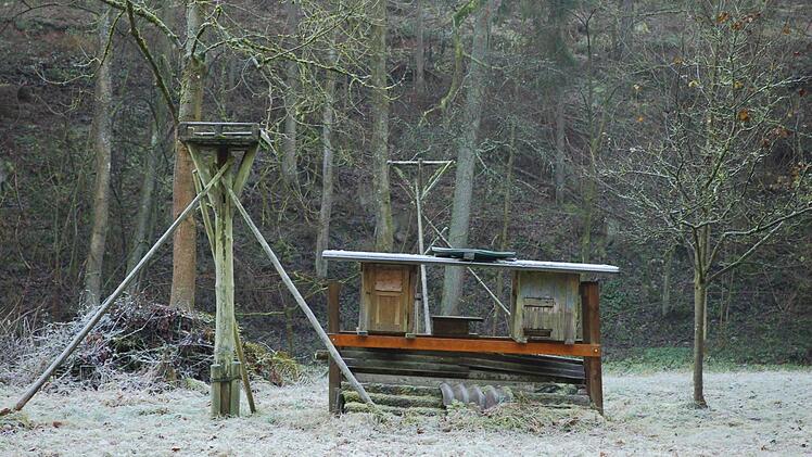 Wenige Meter weiter steht ein Ansitz, auf dem Eulen nur darauf warten müssen, bis eine Maus zu leichtsinnig wird. Eulen nehmen kein Aas an. Wer ihr Nahrungsangebot verbessern will, der muss für lebende Beute sorgen - so wie Gerold Schlosser. Andere Greifvögel sind leichter zu bedienen. Für sie hat Schlosser eine Futterplattform auf einer Stange befestigt. "Wenn ich komme, sind oft schon die Bussarde in der Luft und warten darauf, dass sie etwas bekommen", erzählt Schlosser. Und wenig später ruft Frank Reißenweber tatsächlich: "Da ist ja auch schon einer!" Der Bussard allerdings streicht ab. Die Fremden, die Gerold Schlosser dabei hat, sind ihm wohl nicht geheuer. Die beiden Naturfreunde stiefeln durchs reifbedeckte Gras zu einer Brücke über den Bieberbach. Dort wurde der Lauf des Gewässers in den vergangenen Jahren umgestaltet, renaturiert.