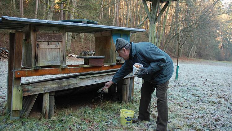 Nistkästen für Vögel fallen an einigen Bäumen auf. "Die gibt es im ganzen Grund hier. Ich betreue inzwischen rund 40 Stück", erzählt Schlosser. Mitten in der Wiese zieht ein Bauwerk aus Holz die Blicke auf sich. "Das ist eine Mäuseburg", erklärt Gerold Schlosser. Die kleinen Nager finden hier Unterschlupf und werden sogar gefüttert.