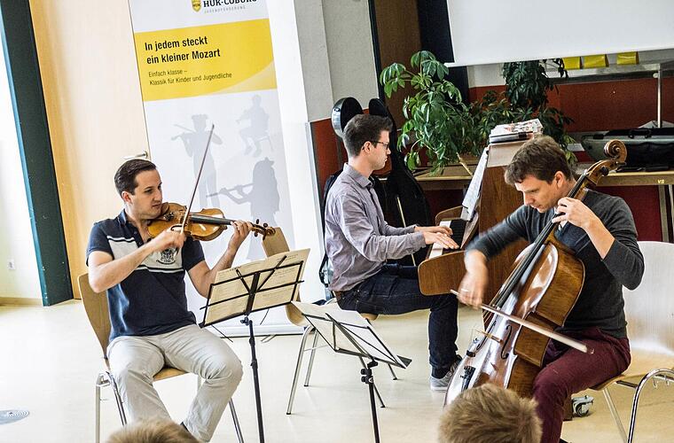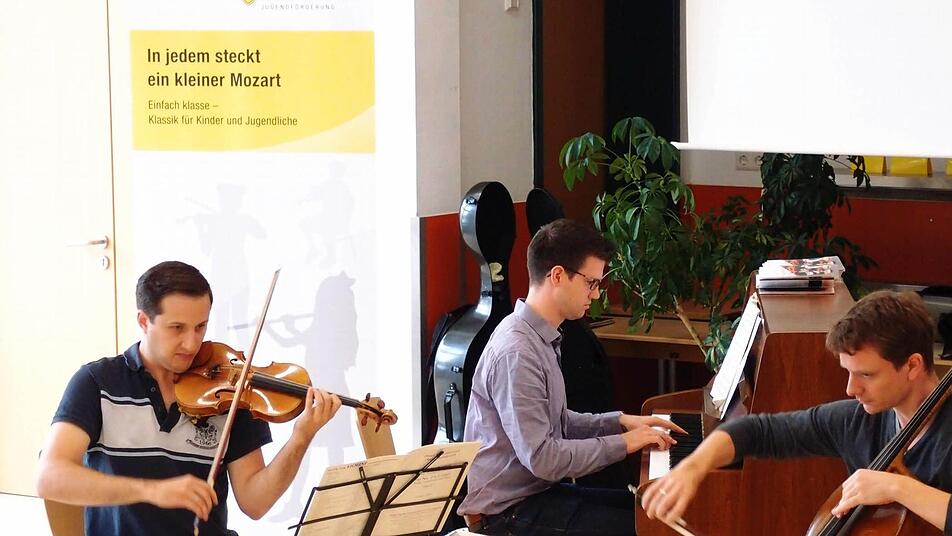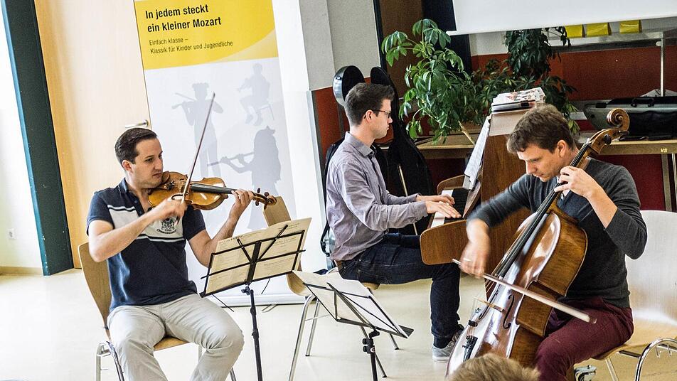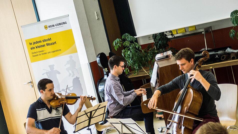 So sieht Musikunterricht der ungewöhnlichen Art aus. Für ein besonderes Gastspiel verwandelt sich die Mensa des Gymnasiums Ernestinums vorübergehend in einen Musiksaal. "In jedem steckt ein kleiner Mozart" steht auf zwei großen Aufstellern. Dazwischen platzieren sich für eineinhalb Stunden die Musiker des Aramis-Trios um den Geiger Martin Emmerich, Konzertmeister im Philharmonischen Orchester des Landestheaters.