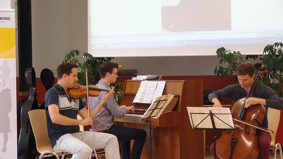 Mit klug ausgewählten Ausschnitten aus dem 2. Klaviertrio von Schostakowitsch beleuchten die Musiker das Spannungsfeld zwischen Kunst und Politik, zwischen Freiheit und Unterdrückung durch totalitäre Regime. Vor allem aber lassen sie hörbar werden, wie Schostakowitsch in seinen Werken immer wieder versucht hat, doppelbödig zu komponieren. Geschickt lenken Martin Emmerich und seine Trio-Partner Heiner Reich am Violoncello und Fabian Wankmüller am Klavier immer wieder die Aufmerksamkeit der Schüler auf die ausgeklügelten Techniken des Komponisten, hinter einer scheinbar optimistisch tönenden Oberfläche dennoch immer wieder Abgründe anklingen zu lassen.