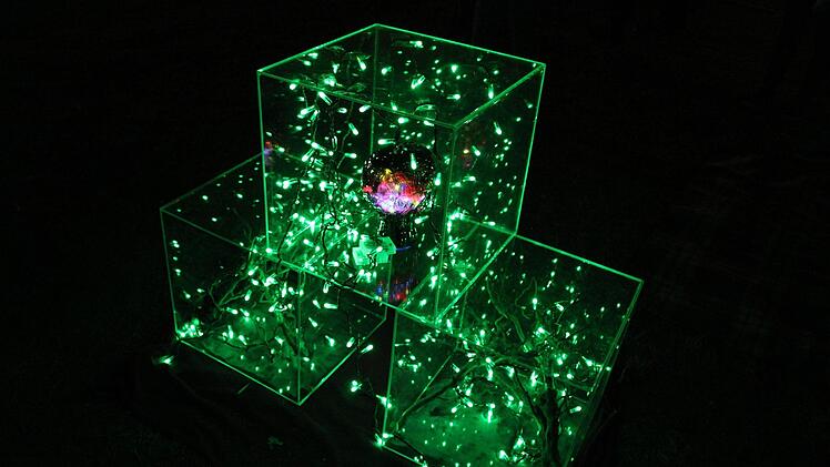 Außen die zwar nicht spektakuläre, dafür aber in spannenden Linien die Wege führende Beleuchtung des Hofgartens unter den dann sehr wohl spektakulären, die Veste wieder umfingernden Laserstrahlen. Die Fassade der Ehrenburg hatte sich ebenfalls in eine rhythmisch pulsierende Filmfläche verwandelt. Auf der Veste dann die Fassaden verwandelnden Lichtkunst-Fantasien von Hanna Dallmer-Zerbe.