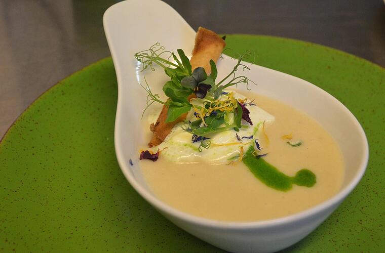 Fein püriert mit Sahne angereichert und abgeschmeckt, kann die Suppe schon in die Teller, um garniert zu werden. Sahnehäubchen, Kräuter und eine Spur selbst gemachten Kräuteröls machen daraus einen Hingucker, ehe die Frühlingsrolle als Tüpfelchen auf dem Sahnehäubchen dazu kommt.