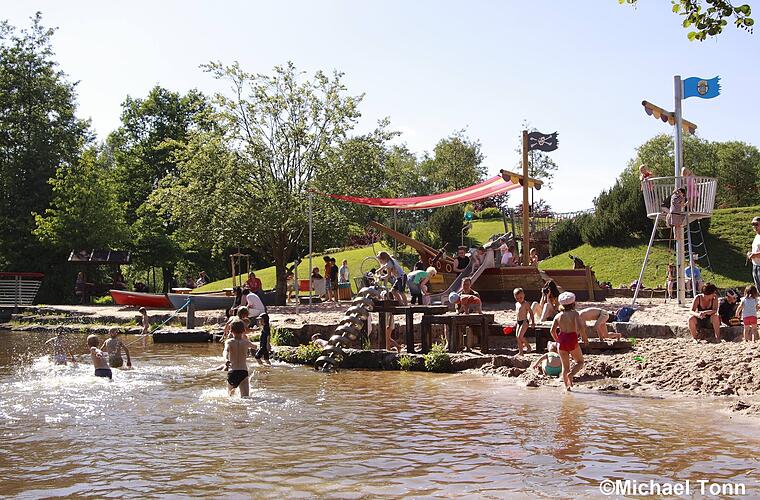 Besonders außergewöhnlich macht die Anlage vor allem die zahlreichen Spielmöglichkeiten für Kinder. So gibt es hier einen Skatepark, eine Kletterschlucht, ein Heckenlabyrinth und einen Wassermatsch-Bereich -perfekt für heiße Sommertage. Nach dem Spielen sorgt das Seecafé für eine Stärkung oder ein kühles Getränk im Schatten.