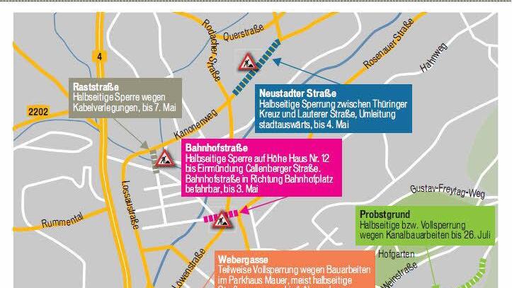 Es werde bei allen Sperrungen und Umleitungen berücksichtigt, wie sie sich auf das gesamte Straßensystem auswirken, versichert Susanne Wittmann. Danach richtet sich dann auch, in welcher Richtung die Umleitungen eingerichtet werden, wenn nur halbseitig gesperrt wird. Während in der Bahnhofstraße die Fahrer stadteinwärts neue Wege suchen müssen, sind in der Neustadter Straße diejenigen betroffen, die stadtauswärts wollen. Die Neustadter Straße ist derzeit zwischen Thüringer Kreuz und Lauterer Straße halbseitig gesperrt. Ab heute wird auch die Raststraße halbseitig gesperrt - vorbereitende Arbeiten dafür, dass im Zug des Lauterausbaus die ganze Brücke abgerissen wird.