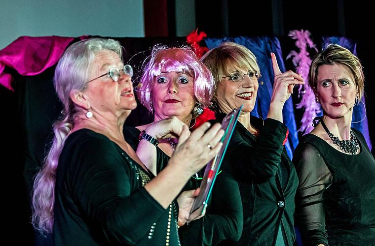 Die Pianistin Anne-Kathrein Jordan ist am betagten Bechstein-Flügel der stets sichere musikalische Rückhalt für das stilistisch kunterbunte Programm, das Christel Opp als Multi-Instrumentalistin an E-Bass, Cello und Saxofon, Kathi Schiller als Moderatorin, Cordelia Viebig, Heike Morneburg und Christine Truchseß-Sudermann als wandlungsfähige Kabarettistinnen-Schar auf das Podium bringen.